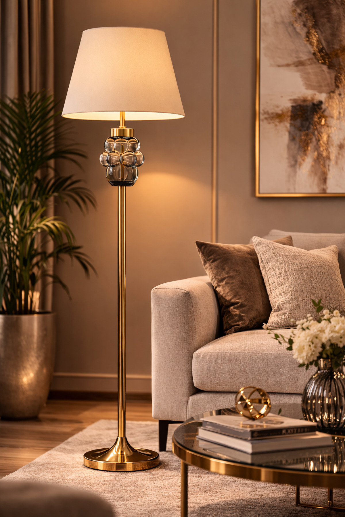 Vinner Aurevio Gold Lambader; füme cam küre detayları ve gold metal gövdesiyle modern yaşam alanlarına sofistike bir aydınlatma ve güçlü bir dekoratif karakter kazandırır; Minimal ve dengeli formu sayesinde salon, oturma odası ve okuma köşelerinde estetik bir ambiyans oluşturur; Füme cam küre tasarımı ışığı zarif şekilde kırarak mekâna sıcak ve yumuşak bir aydınlatma yayılmasını sağlar; Gold metal gövde modern, klasik ve premium dekorasyon stilleriyle kolayca uyum sağlayarak bulunduğu alanın atmosferini yükseltir; Konik krem şapka ışığı dengeli dağıtarak göz yormayan konforlu bir aydınlatma deneyimi sunar; Geniş taban yapısı dengeli ve güvenli kullanım sağlarken uzun gövde tasarımı mekânda dikkat çekici bir dekoratif odak noktası oluşturur; Premium malzeme kalitesi ve zamansız tasarım çizgisi sayesinde hem fonksiyonel hem dekoratif bir aydınlatma ürünü olarak uzun yıllar kullanılabilir; Metal gövde ve cam dekoratif kürelerden üretilmiştir; Gold metal gövde ve füme cam detaylara sahiptir; Konik krem kumaş şapka kullanılmıştır; Toplam yükseklik 163 cm’dir; Şapka çapı 42 cm’dir; Salon, oturma odası, yatak odası ve çalışma alanlarında kullanıma uygundur; E27 duy ile uyumludur; Ürün Kodu; VNR-ARV-163-GD