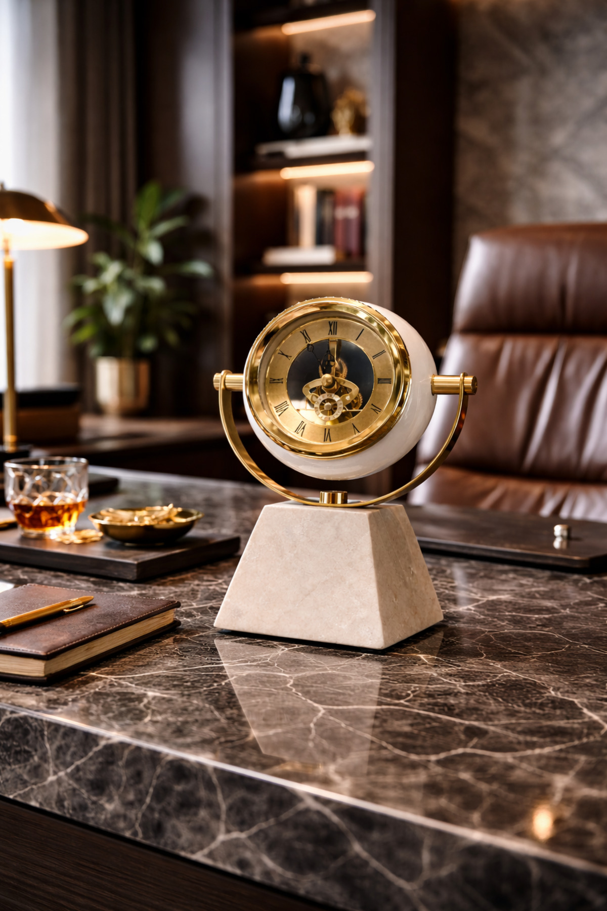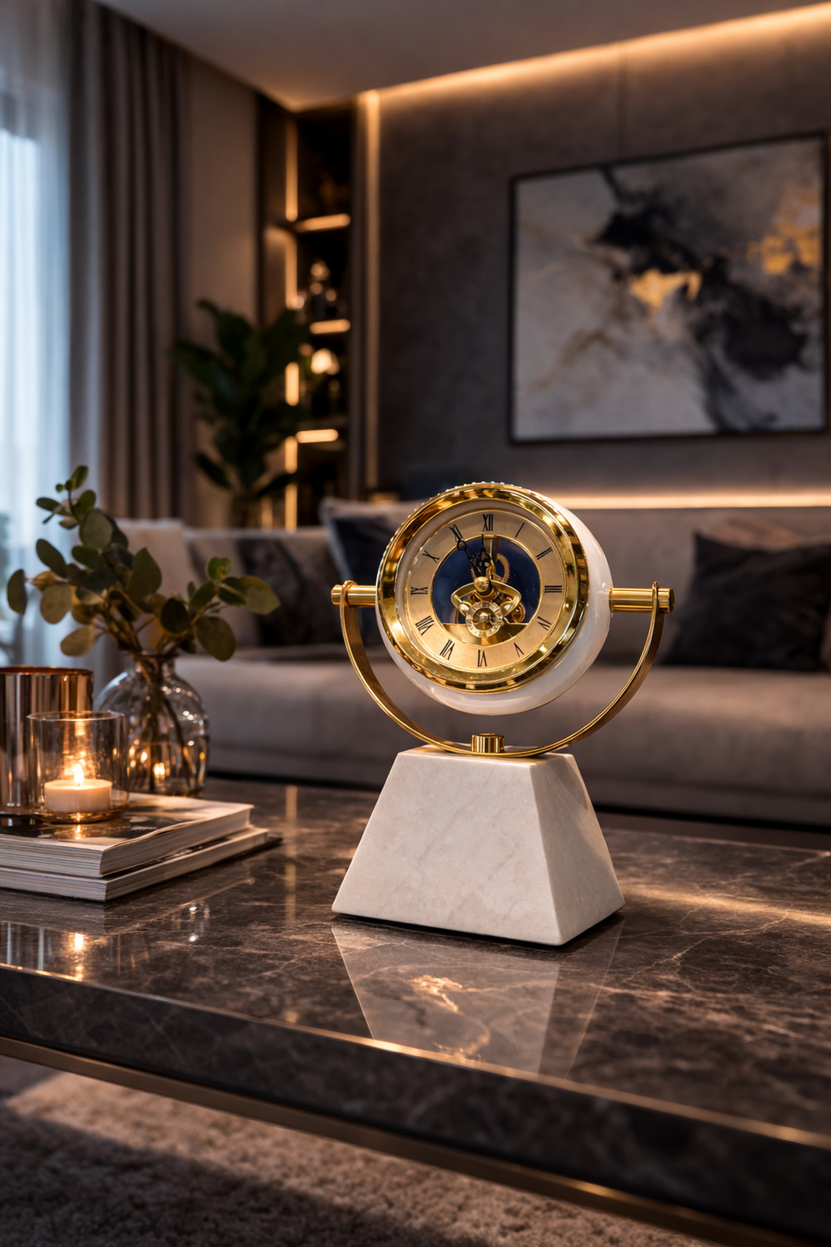 Vinner Axis Marble masa saati mermer kaidesi ve altın tonlu mekanik iskelet tasarımıyla bulunduğu ortama modern ve prestijli bir dekoratif karakter kazandırır; Döner halka formundaki zarif taşıyıcı yapısı saatin mekân içinde dikkat çeken estetik bir obje olarak öne çıkmasını sağlar; Orta bölümde yer alan mekanik iskelet saat mekanizması saatin iç çalışma sistemini görünür hale getirerek tasarıma teknik bir zarafet katar; Doğal mermer görünümlü kaidesi masa üzerinde güçlü ve dengeli bir duruş sağlar; Modern ofis masaları, salon konsolları ve çalışma alanları için tasarlanan bu model bulunduğu mekânda premium bir atmosfer oluşturur; Şık ve zamansız tasarımı sayesinde iş hediyesi veya dekoratif hediye alternatifi olarak tercih edilen özel bir üründür;