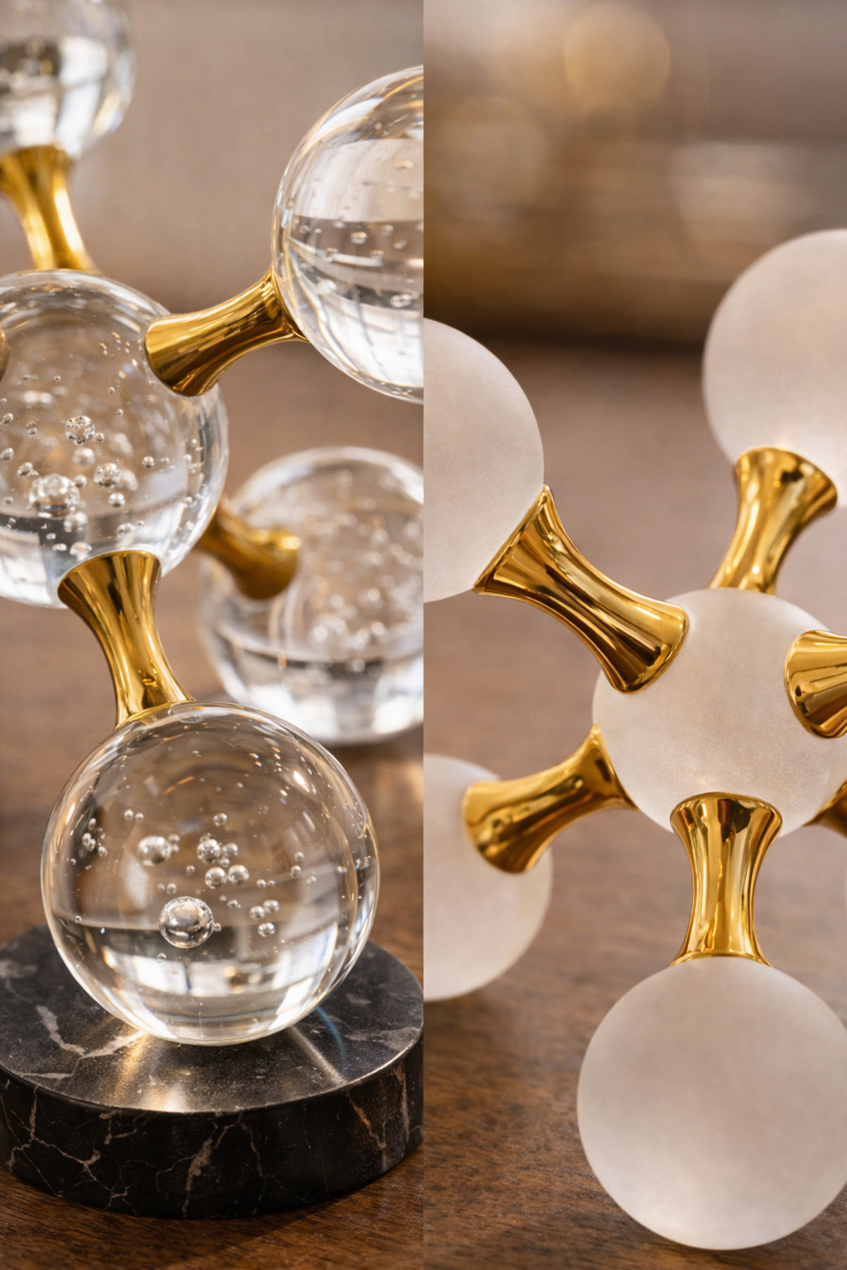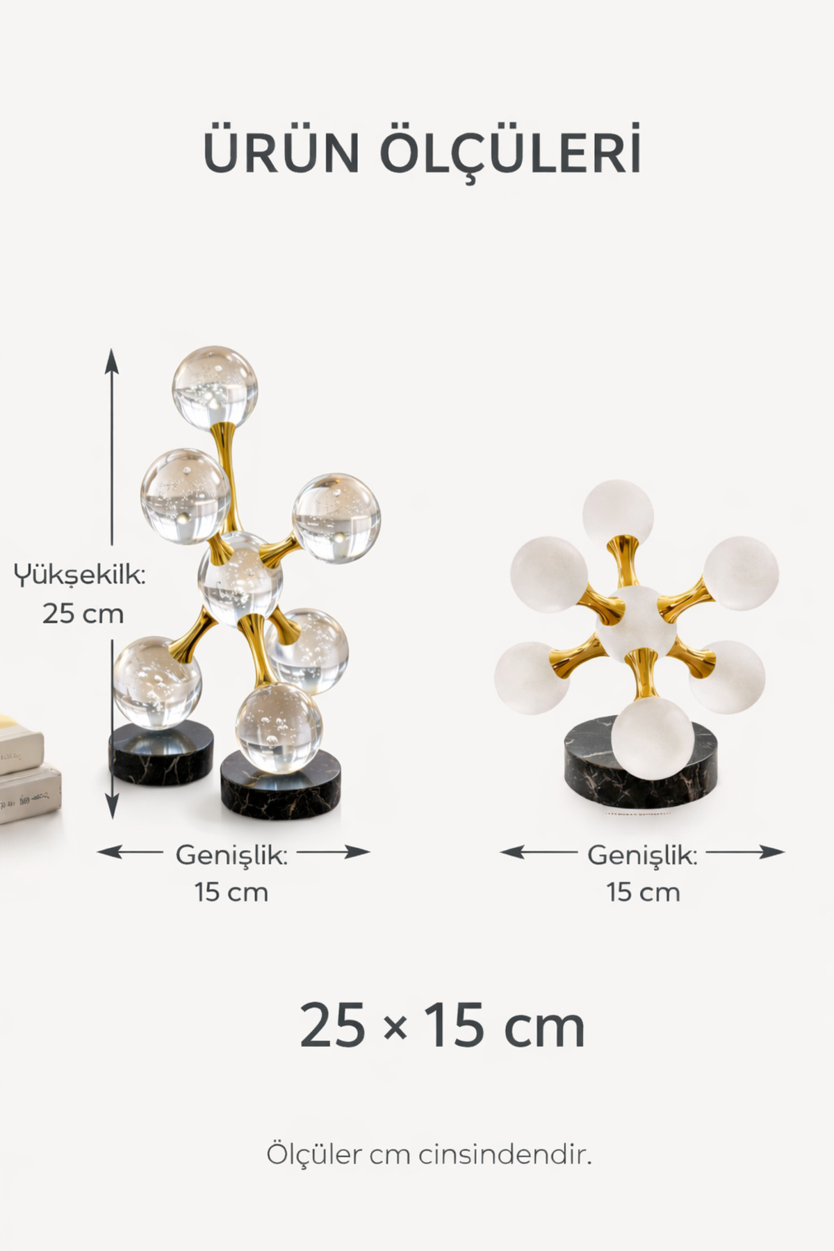 Modern dekorasyon anlayışını cam ve metalin zarif uyumuyla buluşturan Vinner Heliora Gold Cam Dekoratif Obje Seti, bulunduğu ortama sofistike ve dikkat çekici bir atmosfer kazandırır.; Geometrik tasarım dili ve cam küre formu sayesinde modern, minimal ve luxury dekorasyon stilleri ile uyum sağlar ; Parlak gold metal bağlantılar ve şeffaf cam küre detayları ışığı farklı açılardan yansıtarak dekorasyonda estetik bir odak noktası oluşturur.; Minimal ama karakterli tasarımı sayesinde bulunduğu ortamın ambiyansını güçlendirir ve dekorasyona modern bir dokunuş katar ; Salon konsolu, orta sehpa, TV ünitesi, kitaplık ve ofis masası dekorasyonlarında şık bir tamamlayıcı olarak kullanılabilir.; Modern tasarım dili sayesinde hem ev hem de ofis dekorasyonunda güçlü bir dekoratif etki yaratır ; Set içerisinde 2 adet dekoratif obje bulunmaktadır.; Birlikte kullanıldığında dengeli ve modern bir dekoratif kompozisyon oluşturur ; Malzeme: Cam küre ve metal gövde ; Renk: Gold metal – şeffaf cam ; Paket İçeriği: 2 adet dekoratif obje ; Kullanım Alanı: Salon dekoru, orta sehpa dekoru, ofis masa dekoru, kitaplık dekoru ; Model Kodu: VN-HLR-GD02 ;