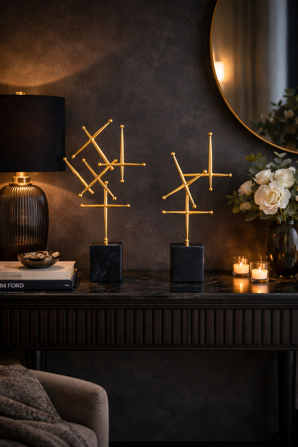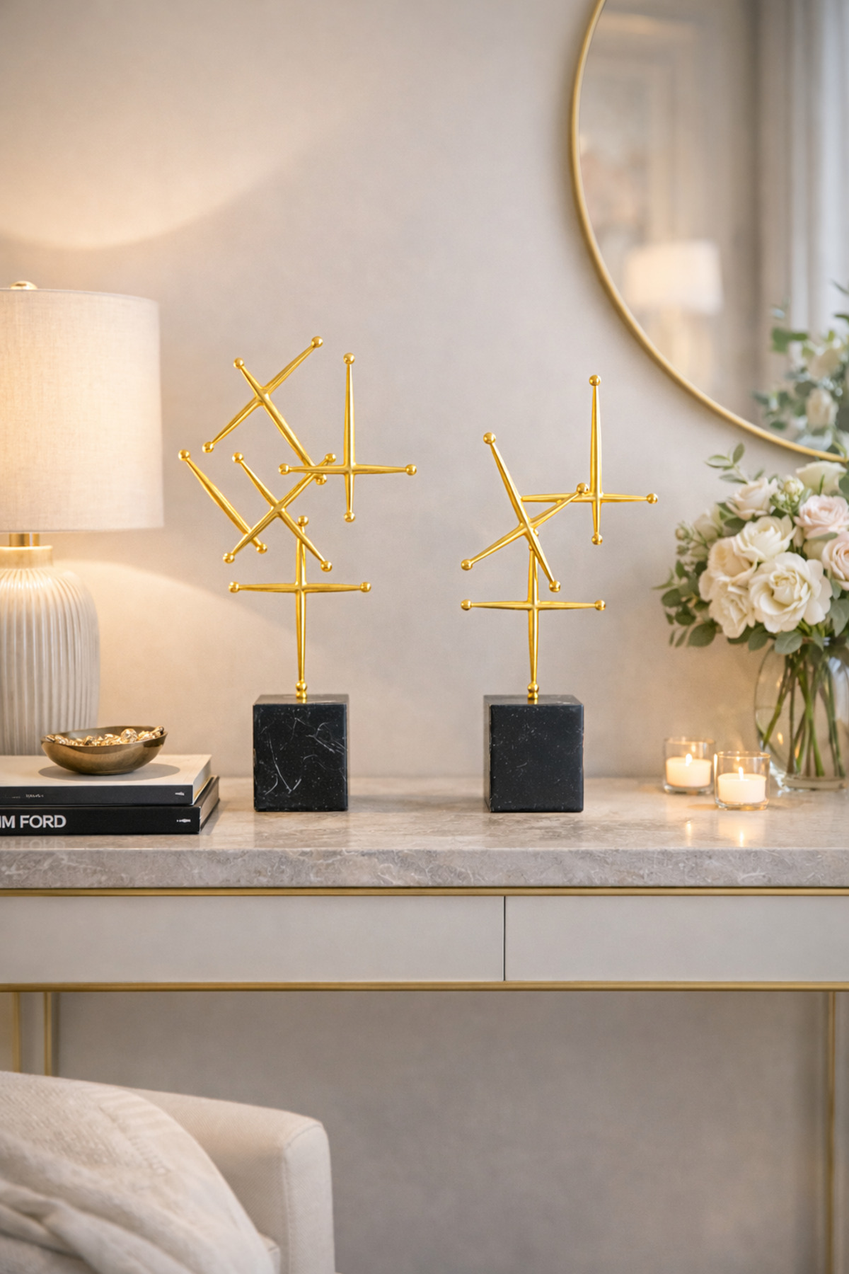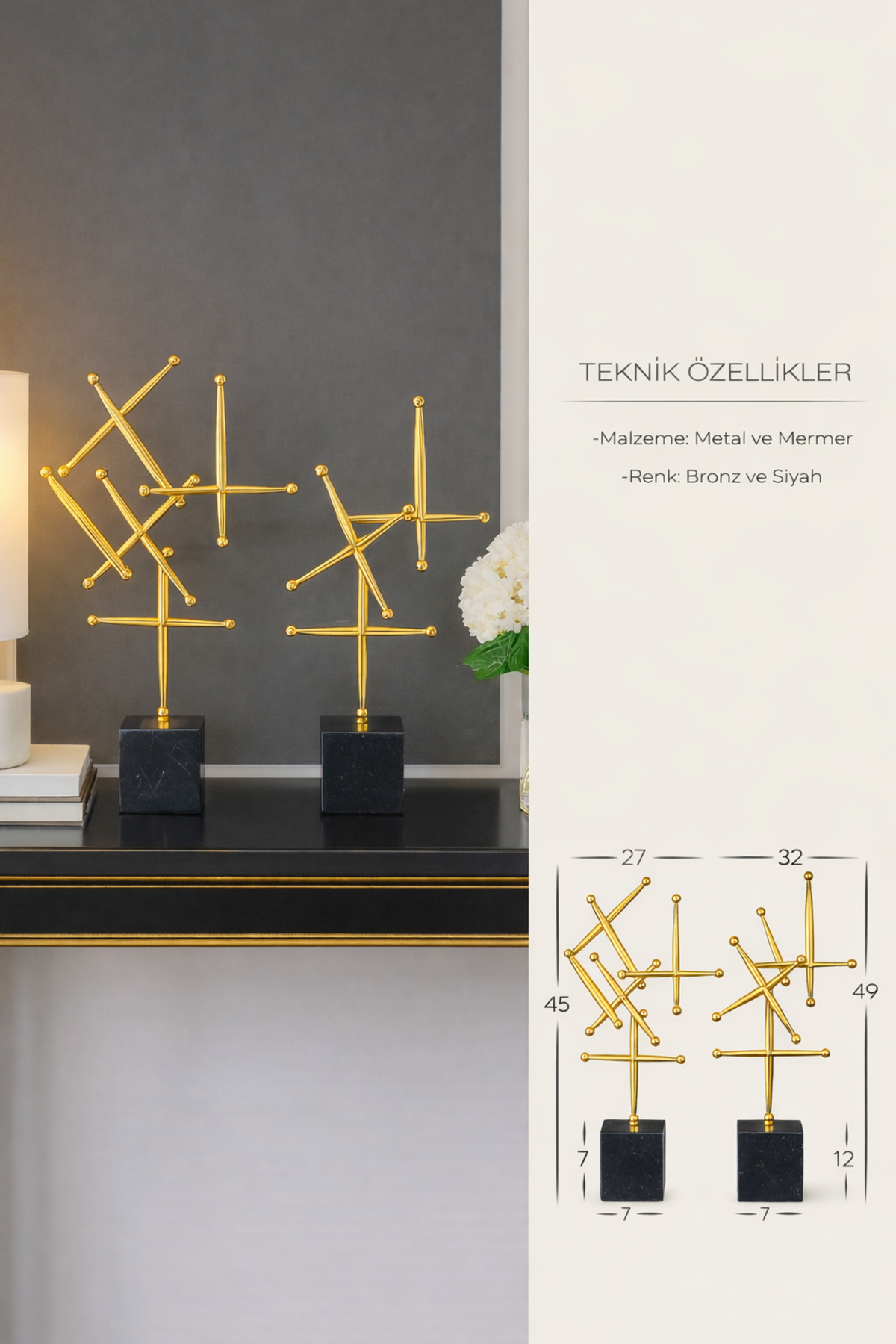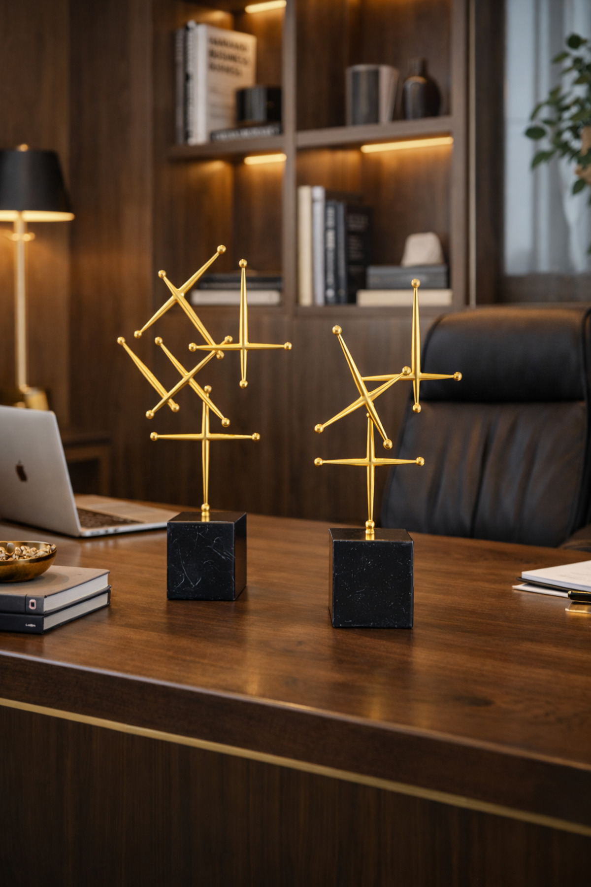 Kalyx Gold Dekoratif Obje Seti 2’li – Metal Mermer Kaideli Modern Salon Ofis Masa Dekoru