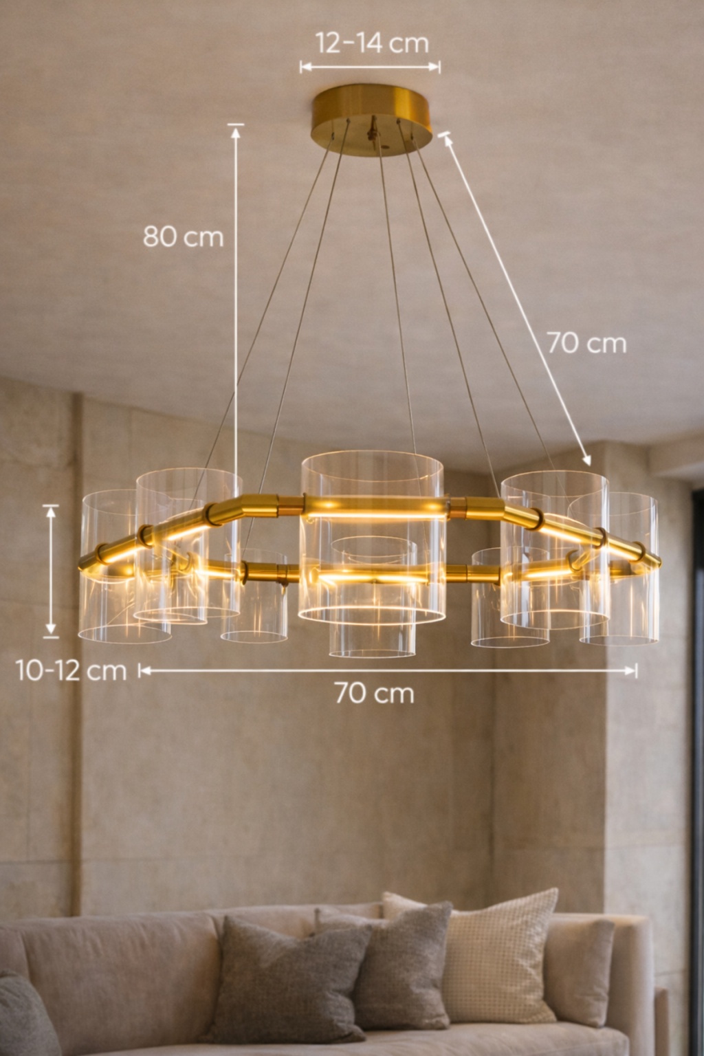 Modern tasarımın zarafetini yaşam alanlarınıza taşıyan VINNER Halka Cam Silindir Avize, bronz metal gövdesi ve şeffaf cam silindir başlıklarıyla salon, villa ve geniş yaşam alanlarında güçlü bir dekoratif etki yaratır; 70 cm geniş halka formu mekâna dengeli ışık dağılımı sağlarken şık ve mimari bir görünüm sunar; Minimalist çizgilerle tasarlanan bronz metal iskelet ve silindir cam başlıklar, modern, art deco ve contemporary dekorasyon tarzlarıyla mükemmel uyum sağlar; Yüksek kaliteli metal gövde ve temperli cam kullanımı sayesinde uzun ömürlü ve dayanıklı bir kullanım sunar; Salon, villa, oturma odası, yüksek tavanlı mekanlar ve projeler için ideal premium avize modelidir; Teknik Özellikler; Marka: VINNER; Ürün Tipi: Halka Cam Silindir Avize; Model: Modern Ring; Çap: 70 cm; Toplam Yükseklik: 80 cm; Başlık Sayısı: 8 adet; Malzeme: Metal Gövde + Cam Silindir; Renk: Bronz; Duy Tipi: E27; Ampul Türü: LED / Rustik Ampul Uyumludur; Kullanım Alanı: Salon; Villa; Oturma Odası; Yemek Odası; Projeler; Montaj: Tavandan askı sistemli;