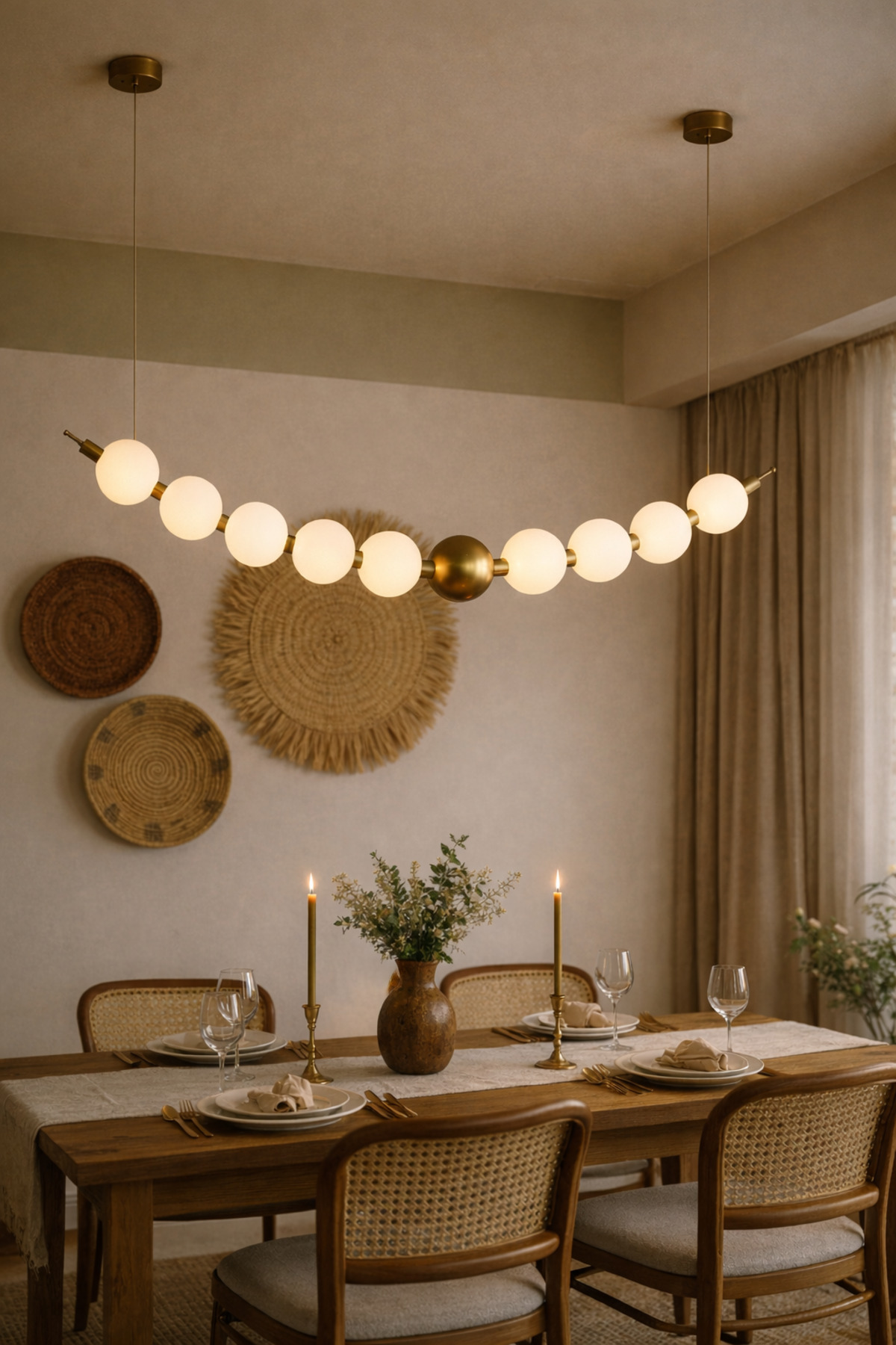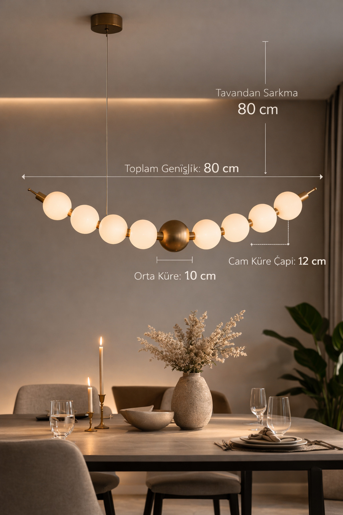 Modern iç mekân tasarımından ilham alan Vinner Nova S80B Avize; opal cam küreleri ve bronz tonlu metal gövdesiyle yaşam alanlarında dengeli ve estetik bir aydınlatma sunar; minimal lineer formu sayesinde salon, yemek odası ve modern yaşam alanlarında güçlü bir dekoratif etki oluşturur; 80 cm genişliğe sahip tasarımı geniş masa ve oturma alanlarında homojen ışık dağılımı sağlar; opal cam küre yapısı ışığı yumuşatarak göz yormayan konforlu bir aydınlatma oluşturur; Bronz metal gövde ve beyaz opal cam küre kombinasyonu modern ve premium bir görünüm sunar; minimalist, modern ve contemporary dekorasyon stilleri ile uyumludur; 12 cm çapında cam küreleri ile dengeli ölçü sunan tasarım; yemek masası, salon, mutfak adası ve oturma alanlarında dekoratif bir odak noktası oluşturur; E27 duy yapısı sayesinde LED ampuller ile uyumludur; enerji tasarruflu ampuller ile yüksek verimli aydınlatma sağlar; Metal gövde yapısı uzun ömürlü kullanım sunarken kaliteli cam küreler ışığın ortama eşit yayılmasını sağlar; Salon, yemek odası, mutfak adası, restoran, kafe ve modern yaşam alanlarında kullanıma uygundur; Kurulum aparatları ürün ile birlikte gönderilmektedir;