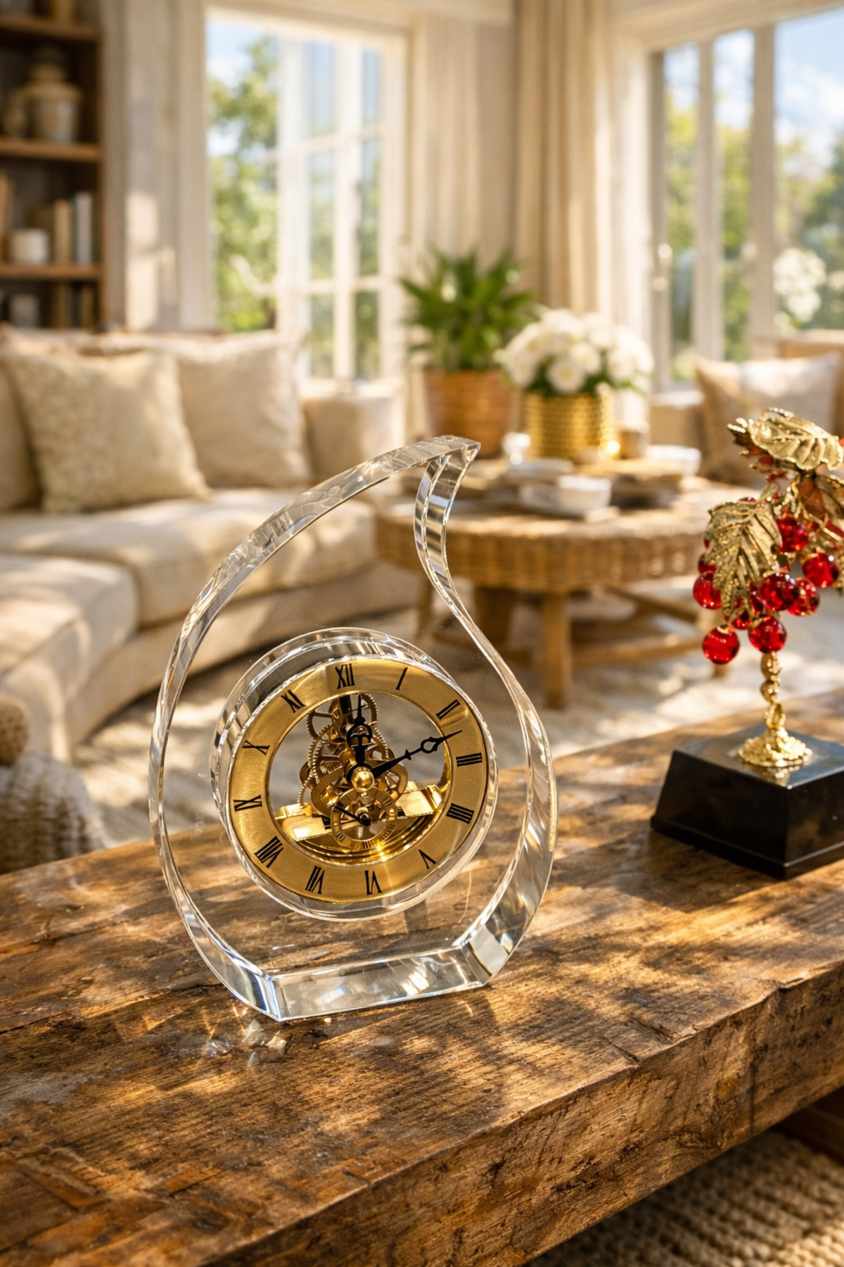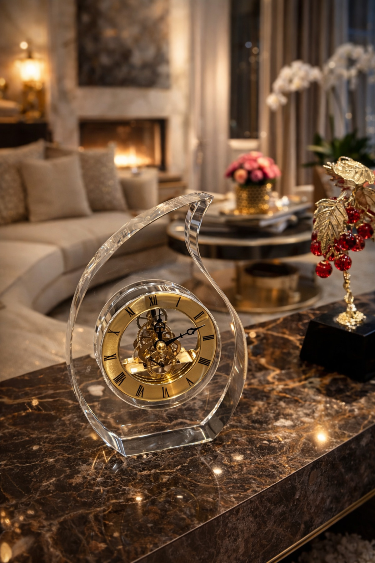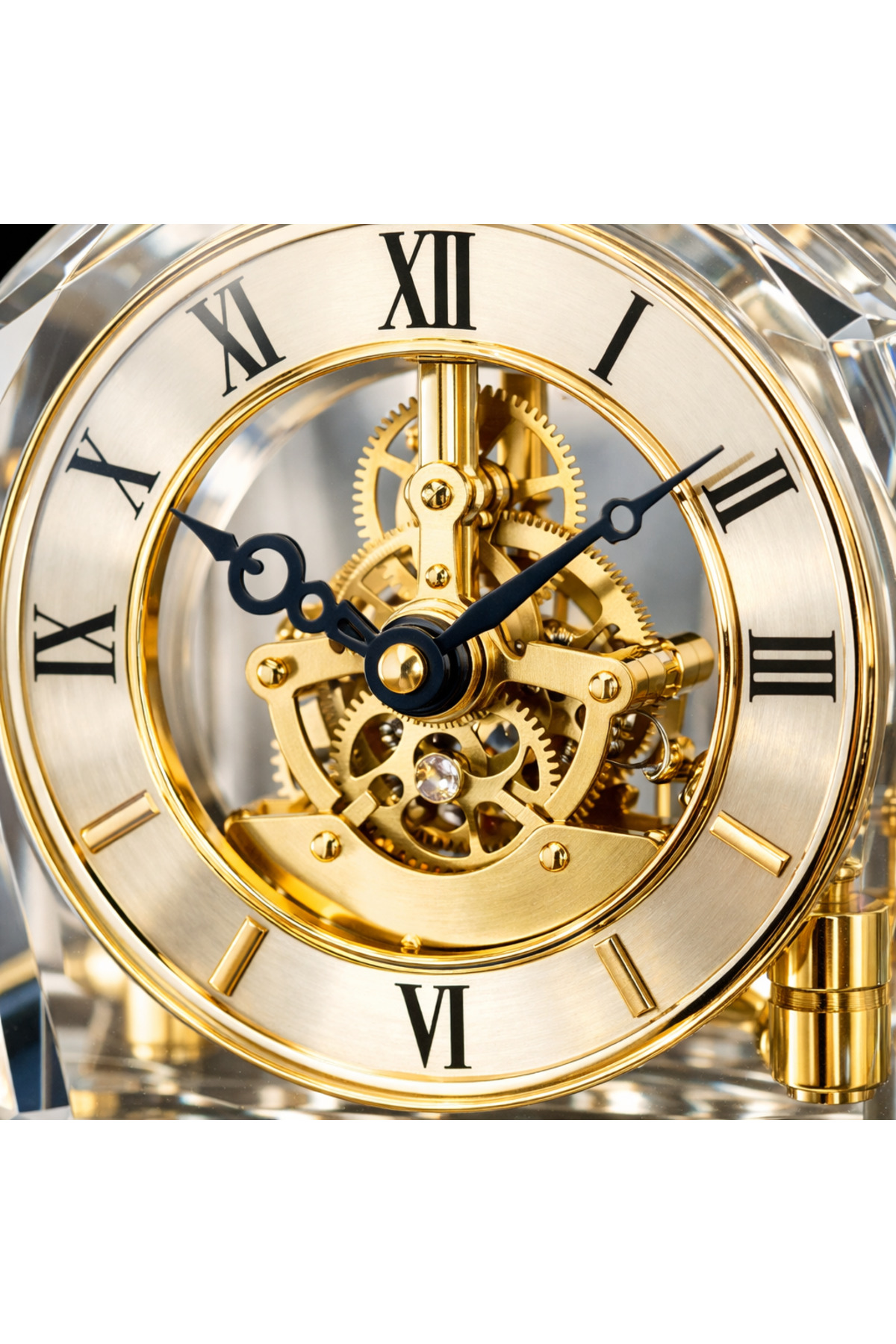 Vinner Crystal Arc Premium Kristal Masa Saati, şeffaf kristal gövdesi ve altın tonlu mekanik iskelet tasarımıyla bulunduğu ortama zarif ve güçlü bir dekoratif karakter kazandırır; Modern ofis masaları, salon sehpaları ve konsol dekorasyonları için tasarlanan bu özel model yaşam alanlarında dikkat çeken premium bir aksesuar olarak öne çıkar; Kristal formu ışığı yansıtarak bulunduğu ortamda lüks ve sofistike bir atmosfer oluşturur; İskelet mekanizması sayesinde saatin iç çalışma yapısı görünür hale gelir ve tasarıma koleksiyon değeri katan estetik bir detay sunar; Minimal fakat etkileyici tasarımı sayesinde modern, klasik ve çağdaş dekorasyon stilleriyle uyum sağlar; Ofis dekorasyonu, salon sehpası, çalışma masası veya kitaplık üzerinde estetik bir tamamlayıcı olarak kullanılabilir; Prestijli tasarımı sayesinde yeni ofis hediyesi, iş hediyesi veya dekoratif hediye alternatifi olarak tercih edilen özel bir üründür;